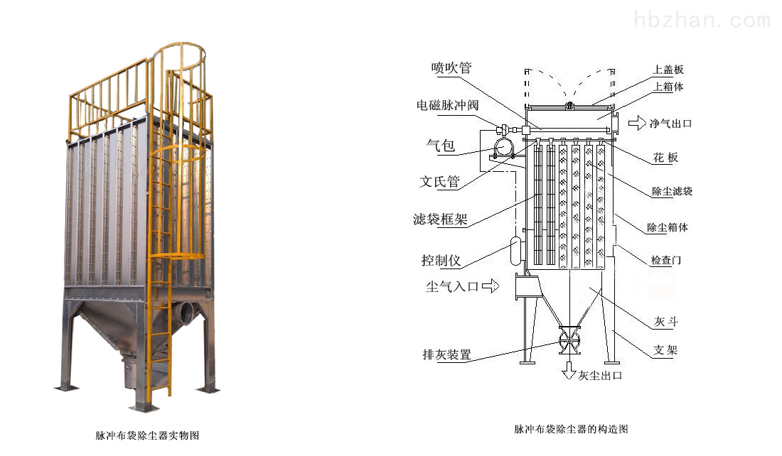 含塵氣體從下開式法蘭進入過濾室,粗顆粒直接落入灰倉,含塵氣體經濾袋過濾,粉塵停留在布袋表面。潔凈氣體通過袋口進入潔凈氣室,由風機排入大氣。當濾袋表面灰塵不斷增加時,程控儀表開始工作。逐個打開脈沖閥,使壓縮空氣通過噴嘴噴出,清洗濾袋,使濾袋突然膨脹。在反向氣流的作用下,布袋表面的粉塵迅速從濾袋中分離出來,落入灰倉,由排灰閥排出。