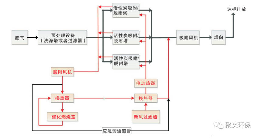 由環(huán)保離心風機將大風量、低濃度有機廢氣吸入活性炭吸附床,在吸附床內(nèi)與多層蜂窩狀活性炭充分凈化(吸附),活性炭內(nèi)部逐漸富集濃縮大量有機廢物,而潔凈的氣體則排入大氣;通過燃燒裝置產(chǎn)生的高溫氣體經(jīng)換熱之后通入活性炭吸附床,使內(nèi)部有機廢物90℃高溫氣化從活性炭孔隙中逸散而出,此時的廢氣濃度遠遠高于初始吸附的廢氣濃度,然后進入催化燃燒裝置(350℃)進行氧化分解成CO2和H2O等無害氣體,氣體經(jīng)由熱交換器將熱量傳遞再次用于脫附,最后排入大氣,以此完成一整套凈化流程。