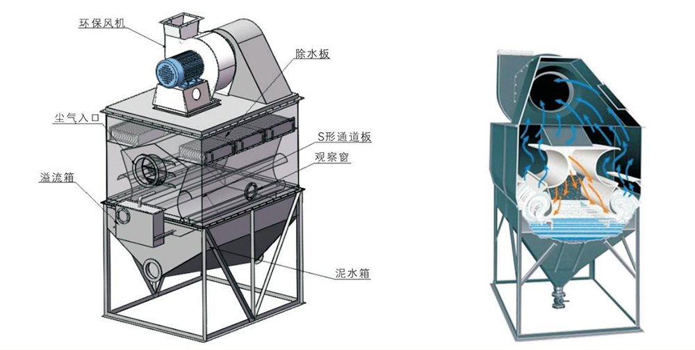 本設(shè)備主要由凈化箱、泥水箱、風(fēng)機底蓋、擋水板、“S” 形板、自動補水箱、排污閥及風(fēng)機等部分組成。含塵氣體由進風(fēng)口進入凈化室,氣流轉(zhuǎn)彎向下沖擊于水面,部分較大的塵粒落入水中。當(dāng)含塵氣體以18~35m/s的速度通過上、下葉片間的“S"形通道時,激起大量的水花形成一道水簾,使水、氣充分接觸,絕大部分微細(xì)粉融入水中,使含塵氣體得以充分凈化。凈化后的氣體經(jīng)檔水板去除水霧后經(jīng)風(fēng)機排出?;覊m所形成的污泥沉積在除塵器底部,定期清除。箱內(nèi)的水不斷循環(huán)使用,蒸發(fā)損耗的水由自動補水箱內(nèi)的浮球閥進行補充,保持水位的恒定。
